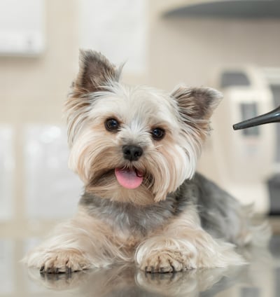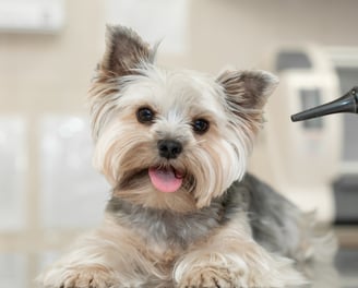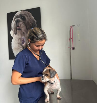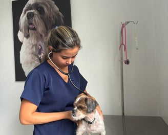 Avaliação completa do estado de saúde do animal, incluindo histórico médico, exame físico e palpação.